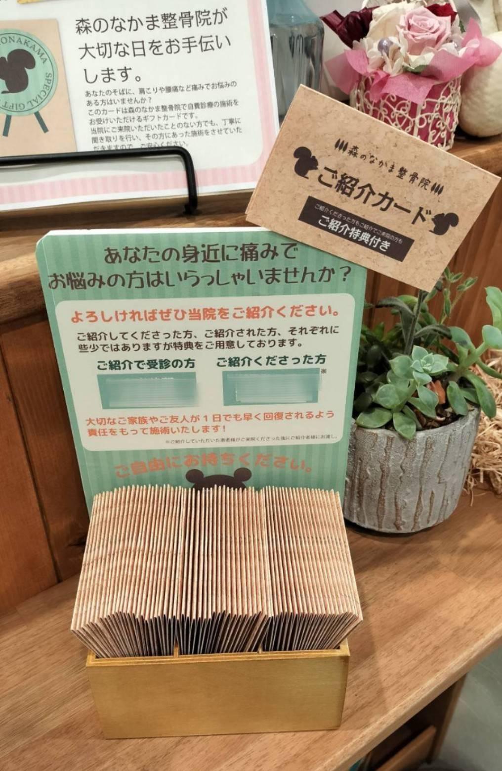 森のなかま整骨院のご紹介カードができました‼ ご紹介でご来院された方も、ご紹介してくださった方にも特典をご用意しておりますので、ご活用ください。 多くの方のお悩みが解決しますよう、心を込めて施術いたします。 どんな特典かはお問い合わせください。 ![]() |
