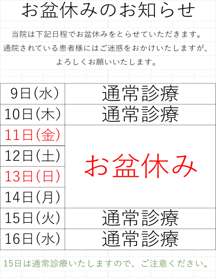 当院は8月11日から14日までの4日間お盆休みをいただきます! ご迷惑をおかけいたしますがよろしくお願いいたします。 15日からは通常診療をいたします。 お盆休み前に30分以上の治療をご希望の方は少しずつ枠が埋まってきているため、お早めにご連絡いただければと思います! よろしくお願いいたします! ![]() |