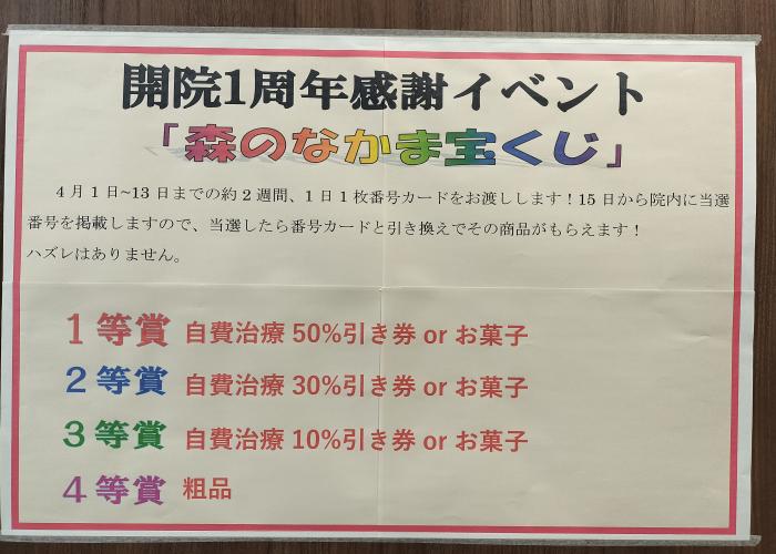 早いもので開院してから1年が経とうとしています! この1年多くの患者様にご来院いただきまして、感謝しております。 さて、4月1日より日頃の感謝を込めまして、開院1周年イベントを行いたいと思います!(^^)! 今回は宝くじを開催します!! 2週間にわたり毎日会計時に番号札をお渡しして、3週間後に当選番号を院内に掲示して、当たった当選番号に応じて景品をお渡しさせていただきます! ハズレはありません。 よろしくお願いいたします(^^)/ ![]() |